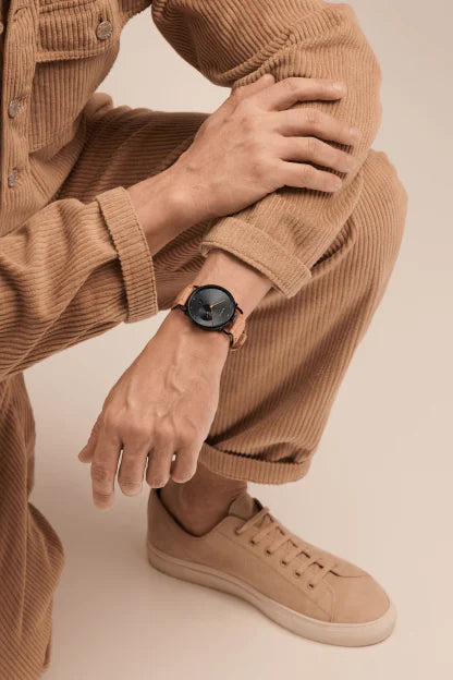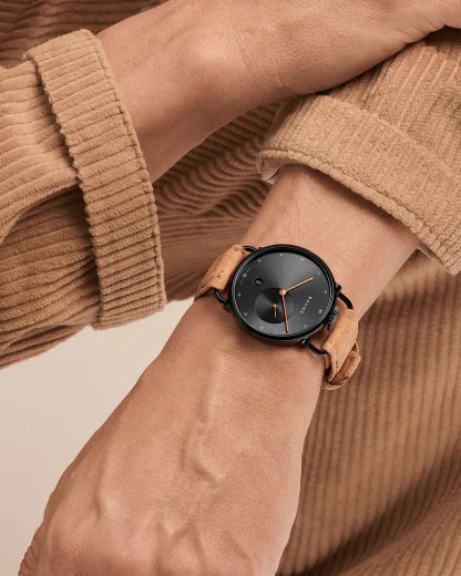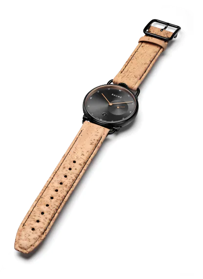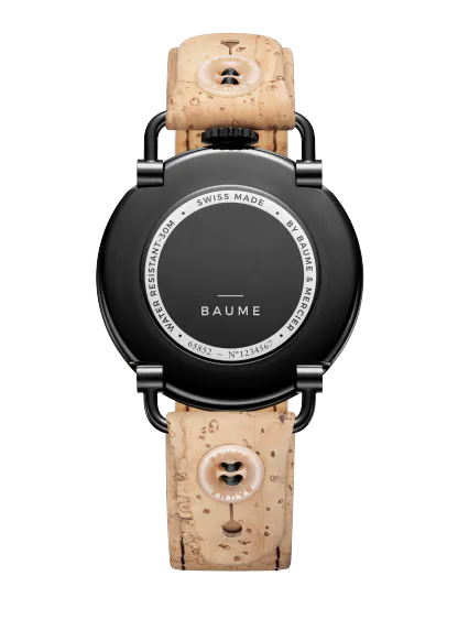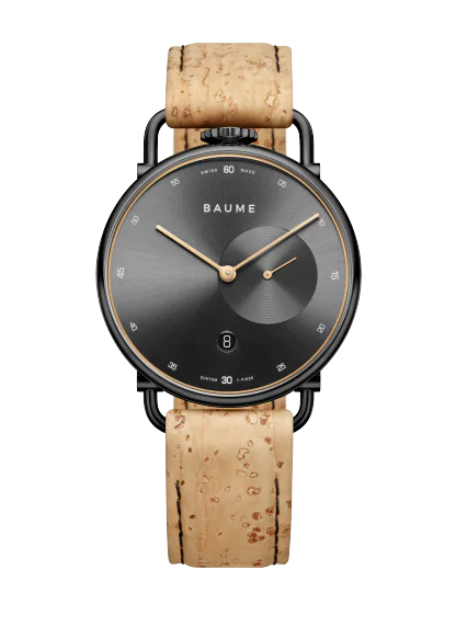 Juwelier Lun offizieller Baume & Mercier Retailer in München Das 41 mm Modell von BAUME hat ein Gehäuse aus schwarzem PVD-beschichteten Stahl und ein schiefergraues Zifferblatt mit vergoldetem Schliff und Sekundenzeiger. Das auswechselbare Armband ist aus Naturkork gefertigt und mit einer schwarzen Dornschließe versehen.