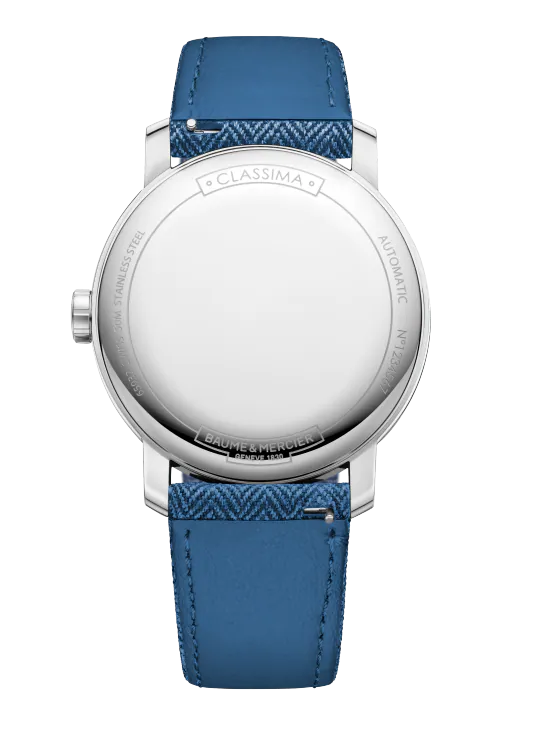 Die Baume Mercier Classima Automatik 10707 verfügt über ein Automatikwerk mit einer Gangreserve von 42 Stunden und zeigt Stunden, Minuten und Sekunden an. Das silberne Zifferblatt mit Sonnenschliff und Fischgrätenmuster wird von einem 42 mm großen Gehäuse umschlossen und betont die blauen arabischen Ziffern, Indizes und Blattzeiger. Die Armbänder bestehen aus blauem Fischgrätenmuster-Stoff (aus Wolle) mit Sattlerstich und schwarzem Alligatorleder. Jede Classima Bespoke Edition Uhr verfügt über ein gewölbtes Gehäuse aus poliertem Edelstahl mit kratzfestem Saphirglas und einem gravierten und personalisierbaren massiven Boden. Ein austauschbares Stoffarmband mit einem zuverlässigen System aus geraden Stegen und Zapfen ist standardmäßig enthalten und ermöglicht einen werkzeuglosen Austausch des hochwertigen Armbands. Zusätzlich wird eine Lederarmband-Option mitgeliefert, mit der Materialien, Muster und Farben ausprobiert werden können. Die Armbänder werden alle mit einer Dornschließe versehen.