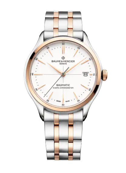 Angetrieben wird diese Clifton Baumatic 10458 von dem zertifizierten Baumatic Chronometerwerk, das höchste Präzision gewährleistet und eine Gangreserve von 5 Tagen bietet. Das Gehäuse besteht aus Edelstahl und ist für ein ausgewogenes Design mit 18 K Rotgold vergoldet.