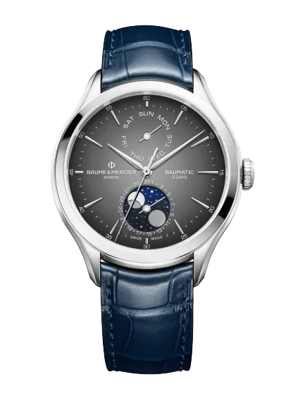 Die elegante Clifton Baumatic 10548 Mondphasenuhr mit Tag-Datum verfügt über ein poliertes Edelstahlgehäuse und ein grau lackiertes Zifferblatt. Mit rhodinierten und genieteten Indexen zieht sie alle Blicke auf sich. Angetrieben von einem Manufakturkaliber mit Automatikaufzug, ist eine nahezu makellose Präzision gewährleistet. Die 42 mm große Uhr aus Edelstahl mit Tag-Datum-Funktion zeichnet sich durch ihr besonderes Design aus. Ein blaues, transparentes Fenster bei 6 Uhr ermöglicht den Blick auf die rhodinierte Mondphasenscheibe, die von einem blauen Sternenhimmel umgeben ist. Zusammen mit den subtilen Details und dem zuverlässigen Baumatic Manufakturkaliber wird die Uhr zu einem begehrenswerten Zeitmesser.
