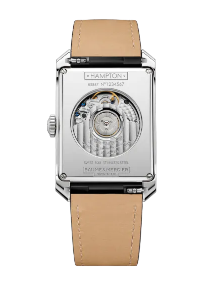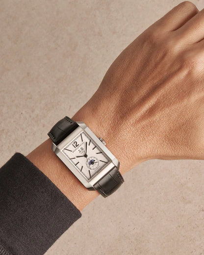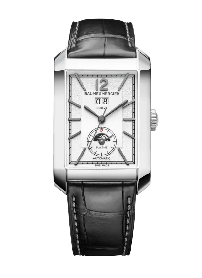 Juwelier Lun offizieller Baume & Mercier Retailer in München Diese gut ausbalancierte Uhr mit doppelter Zeitanzeige wird von einem Schweizer Automatikwerk angetrieben. Sie ist mit einem zeitlosen schwarzen Alligatorlederarmband mit grauer Naht und einem rechteckigen Gehäuse aus poliertem Edelstahl versehen.