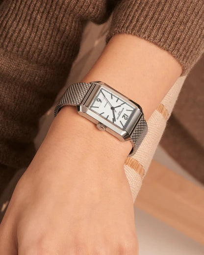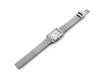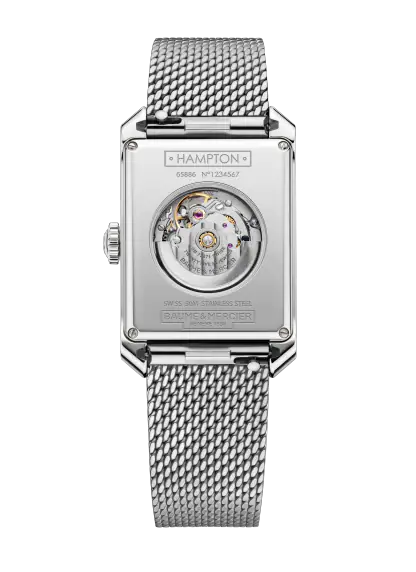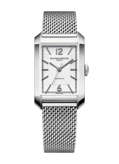 Juwelier Lun offizieller Baume & Mercier Retailer in München Die Hampton 10672 verbindet eine elegante Ästhetik mit einer von der Schweizer Uhrmacherkunst geprägten luxuriösen Raffinesse. Diese rechteckige Uhr verfügt über ein opalisierendes und gekörntes silberfarbenes Zifferblatt. Der Zeitmesser wird an einem austauschbaren integrierten Milanaise-Armband aus poliertem Edelstahl getragen, das ihr einen einzigartigen Retro-Look verleiht.