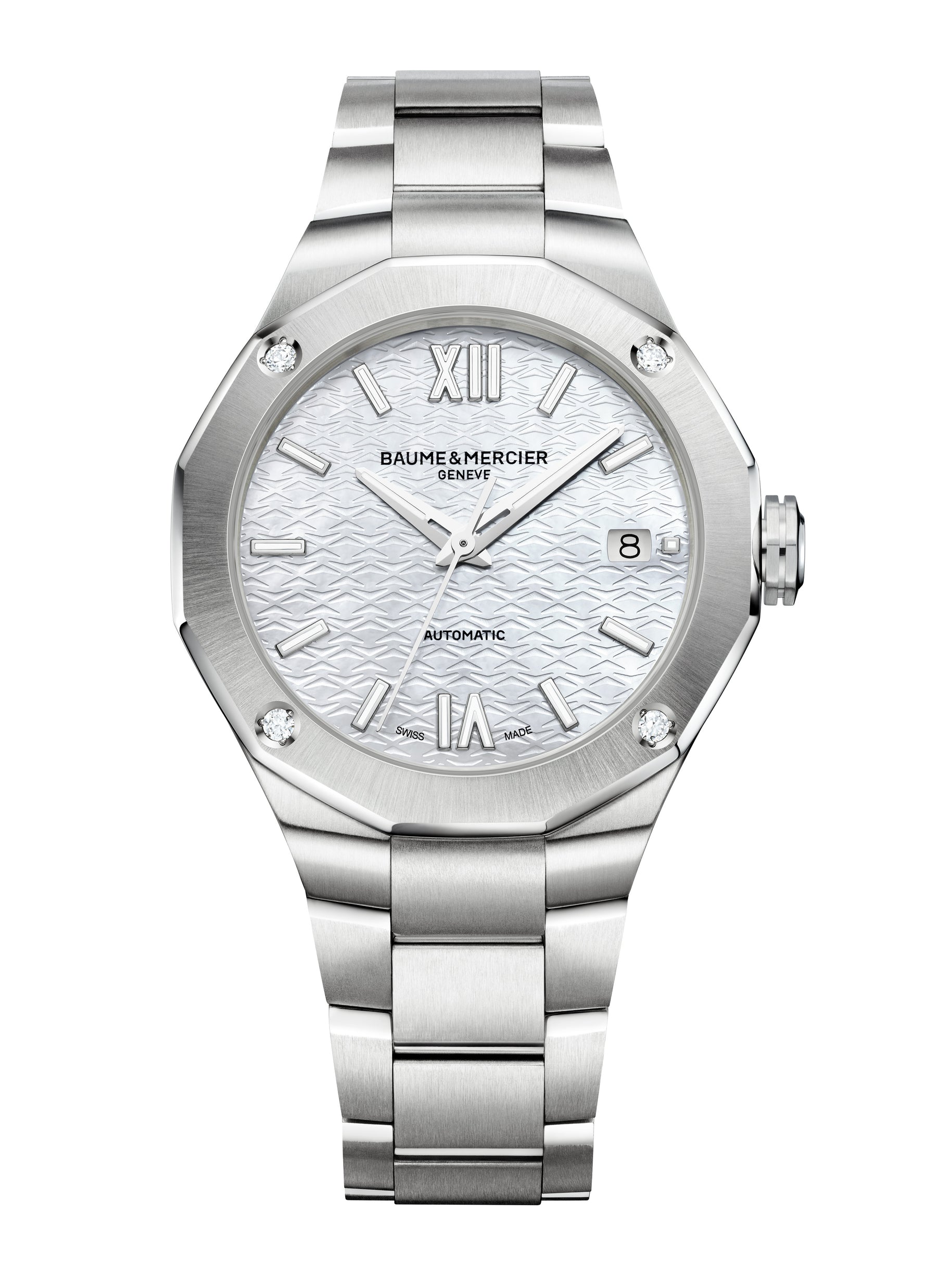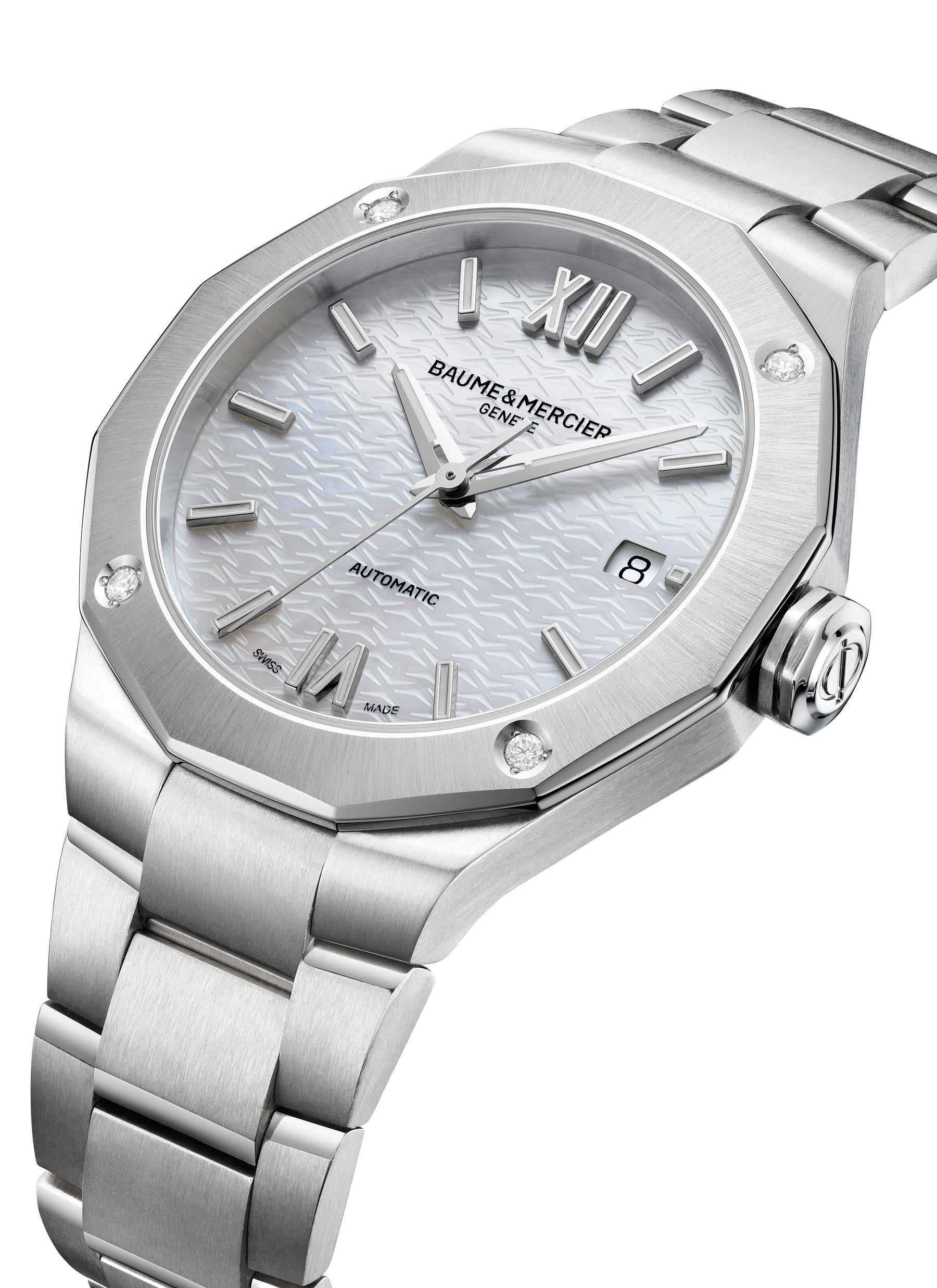 Juwelier Lun offizieller Baume & Mercier Retailer in München Diese Riviera mit „Swiss Made“-Automatikwerk und weißem Perlmuttzifferblatt wird an einem Metallarmband getragen. Wie schon die Originalversion verfügt sie über eine zwölfeckige Lünette, ein einzigartiges Dekor und ein Armbandwechselsystem. Sie richtet sich an selbstbewusste Persönlichkeiten.