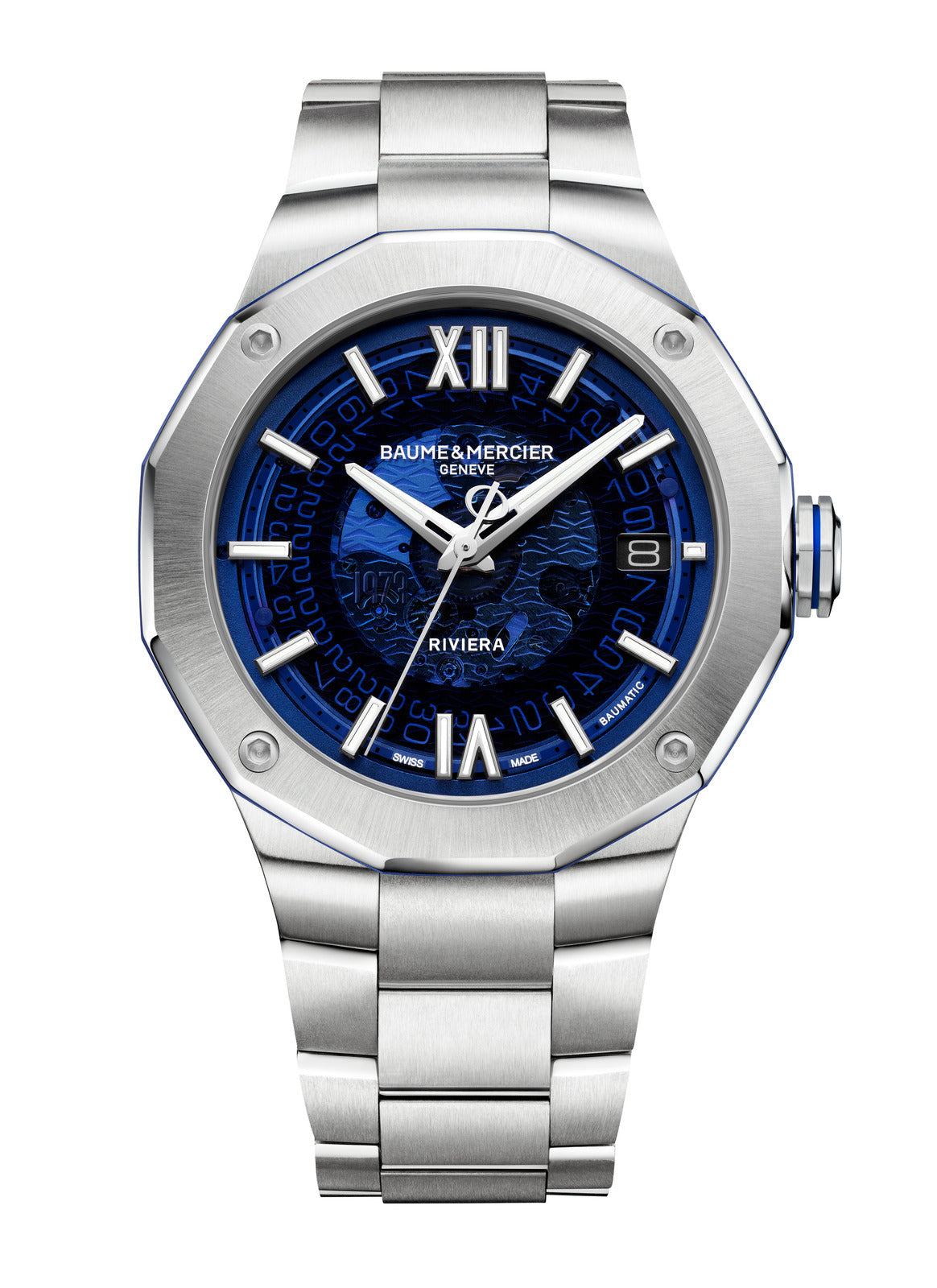 Die Baume Mercier Riviera Baumatic 10749, die erstmals 1973 lanciert wurde, feierte 2021 ihre Rückkehr und bringt das Design einer herausragenden Uhrenepoche zurück. Sie behält ihre sportliche Eleganz bei. Das Edelstahlgehäuse mit beeindruckenden Dimensionen, die zwölfeckige Lünette mit vier Schrauben, ein "Swiss Made" Manufakturwerk und integrierte, austauschbare Edelstahl- oder Kautschukbänder. Das Originaldesign bleibt unverändert, aber die Uhr ist auf den aktuellen Zeitgeist ausgerichtet. Angetrieben von dem renommierten hauseigenen Baumatic Kaliber, ist die Baume Mercier Riviera Baumatic 10749 die perfekte tägliche Schweizer Luxus Uhr. Sie ist ausgestattet mit einem transparenten blauen Saphirglasziffernblatt, einem austauschbaren Metallarmband und einem Sichtboden, die den sportlichen Look des "Swiss Made" Zeitmessers vervollständigen.
