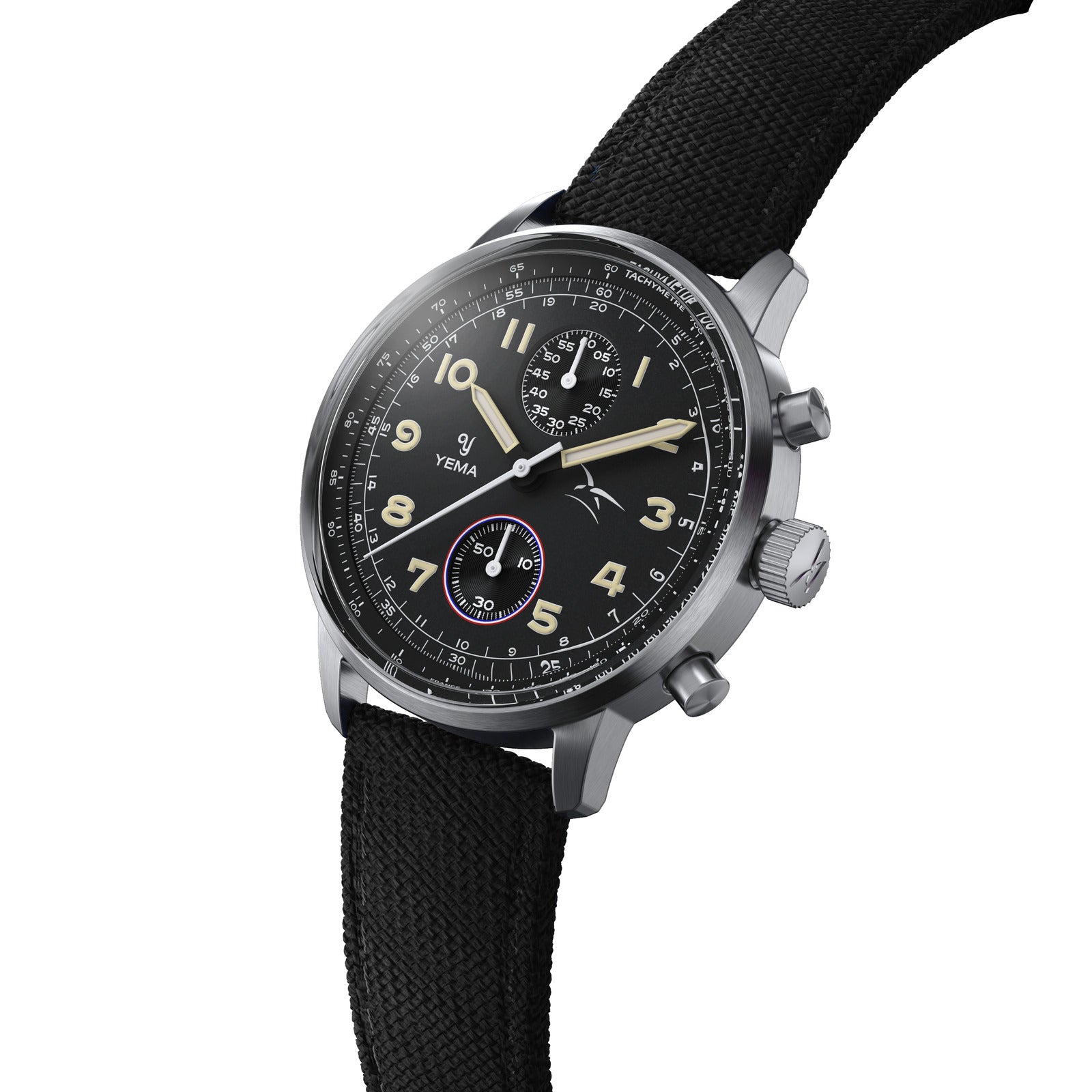 Canvas-Armband Das in Franche-Comté hergestellte Canvas-Armband aus Leinenstoff ist farblich auf das Zifferblatt abgestimmt. Es zeigt das Logo der französischen Luftwaffe auf der lederbeschichteten Unterseite, die für hohen Tragekomfort sorgt.