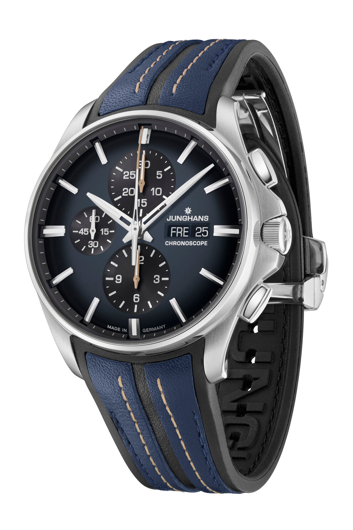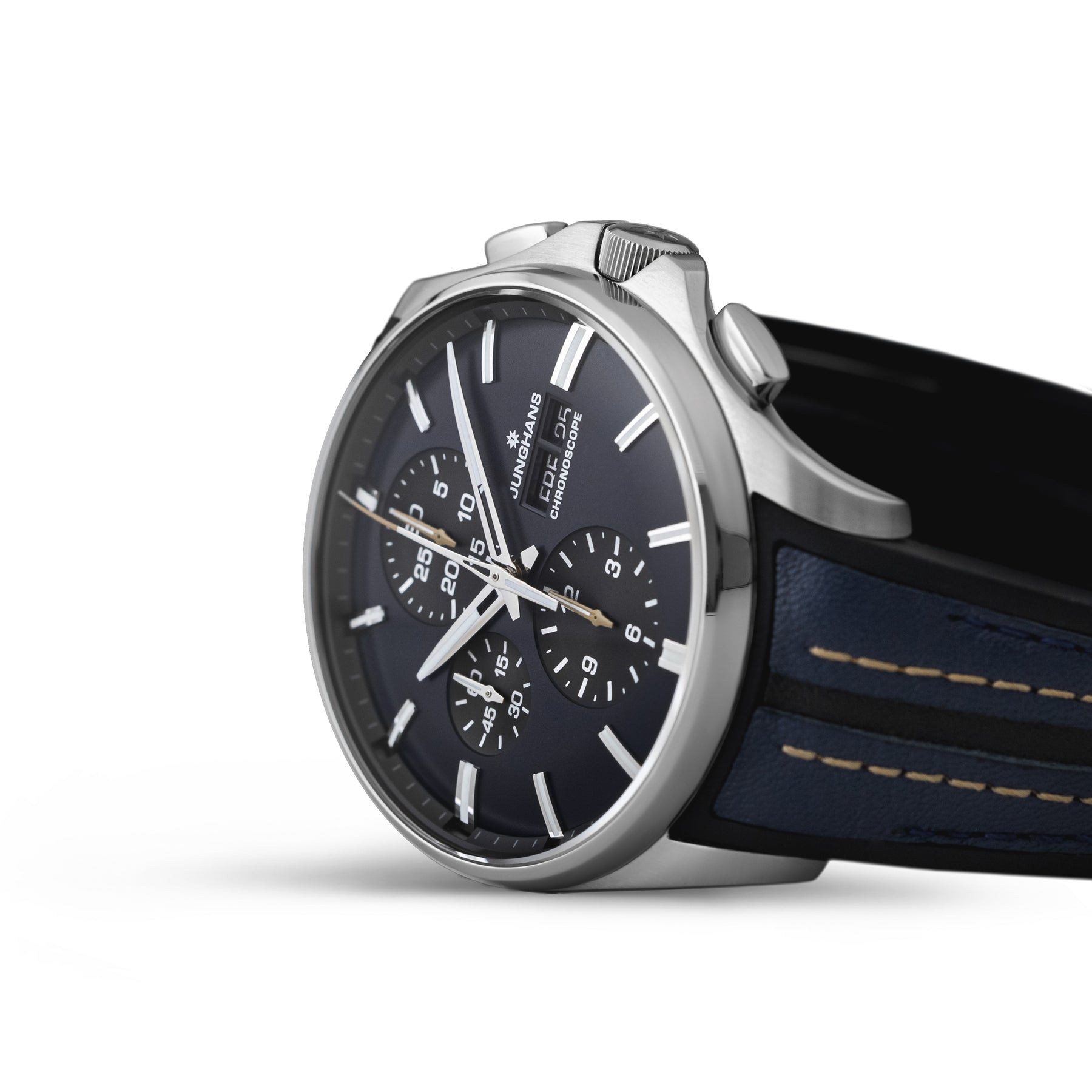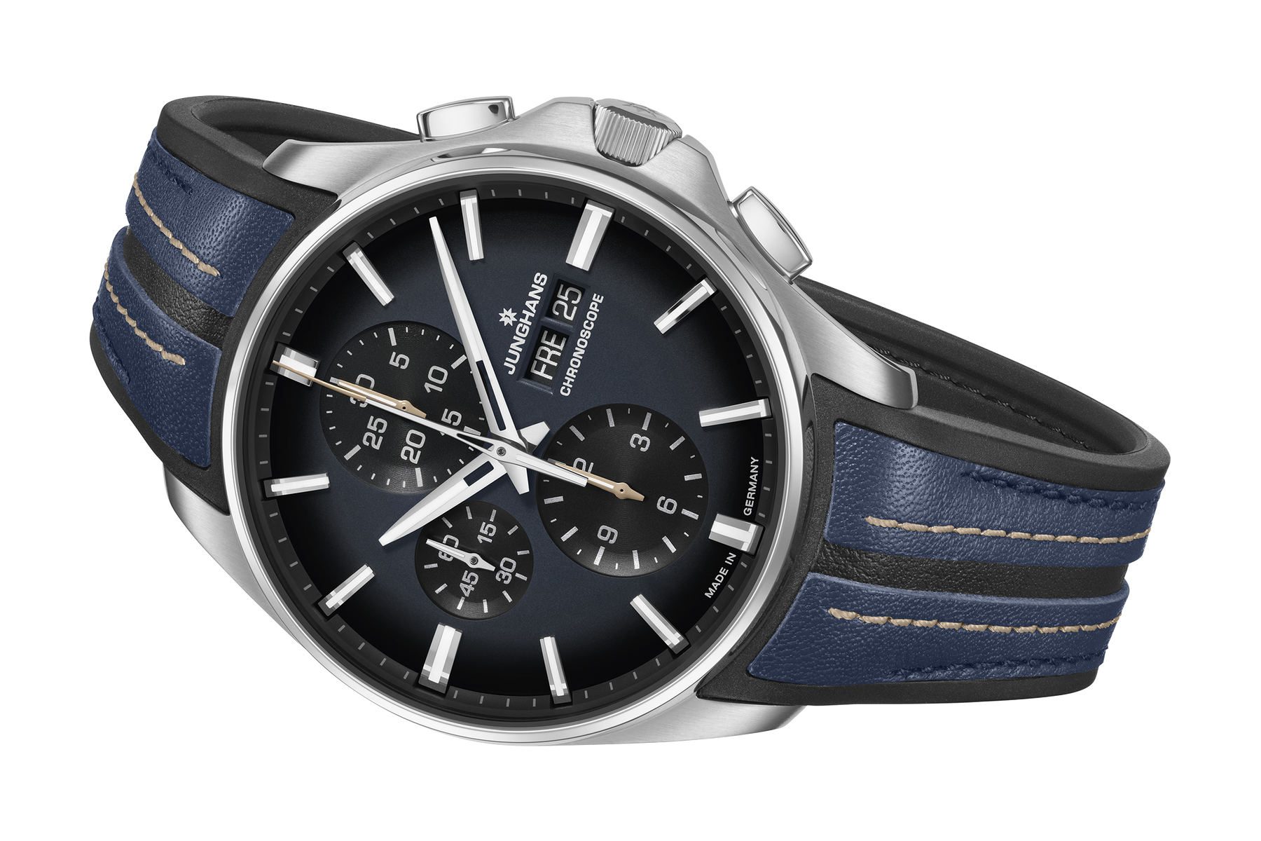 Bei der Arbeit oder beim Sport. Egal wo oder wollen, die Meister S Chronoscope in Mitternachtsblau bleibt praktisch durchgängig. Das ergonomische Armband bietet durch den auf der Haut aufliegenden, erhabenen Junghans-Schriftzug aus Kautschuk eine gute Belüftung.