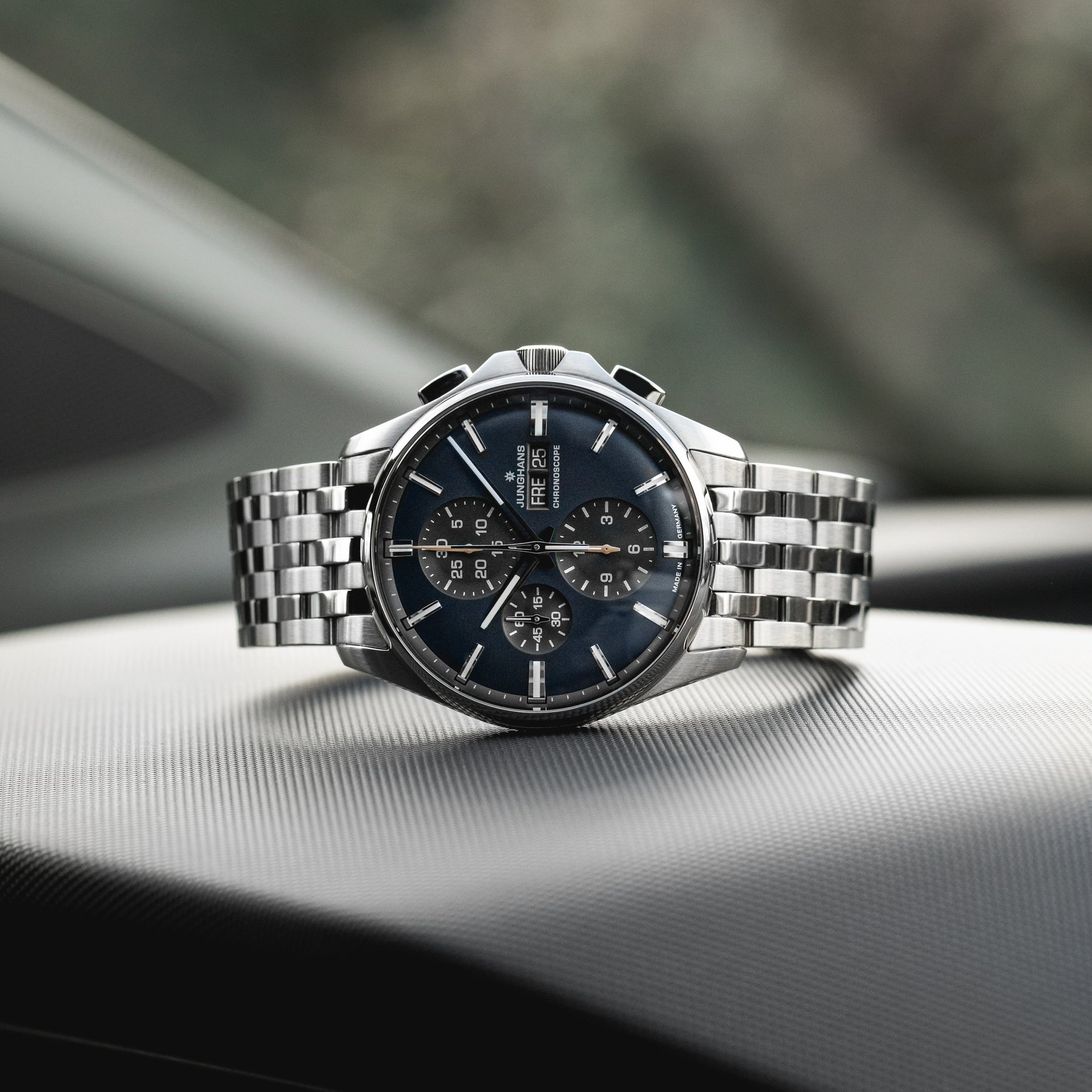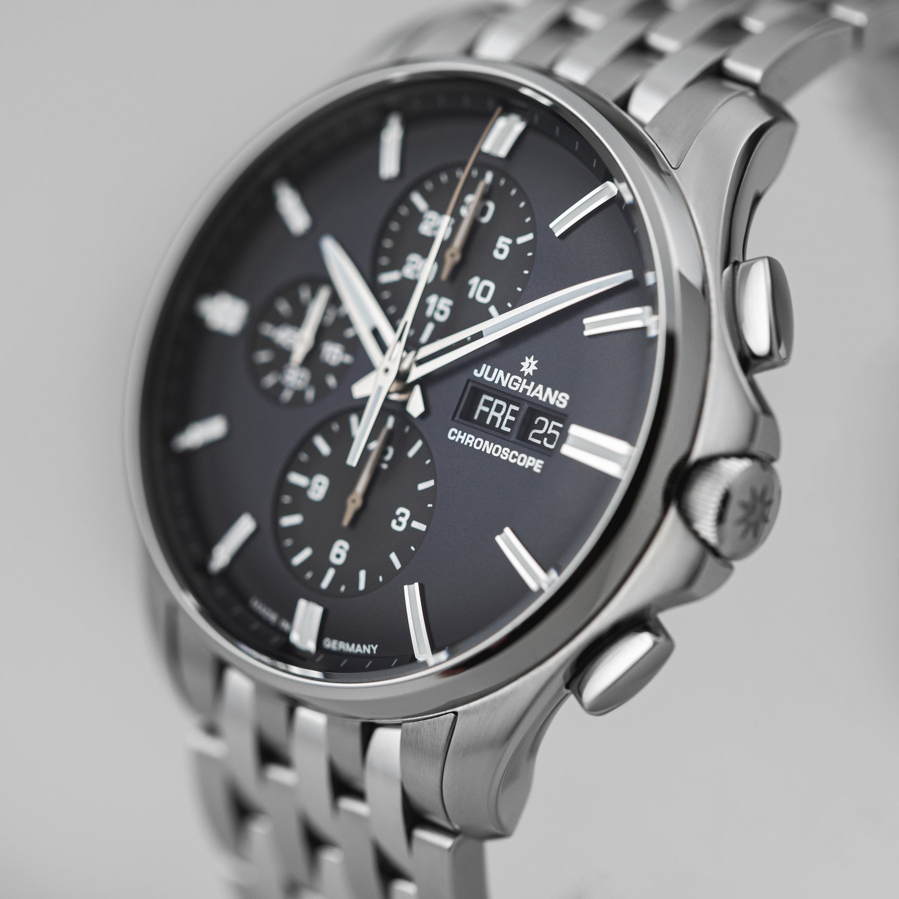 Bei der Arbeit oder beim Sport. Egal wo oder wollen, die Meister S Chronoscope in Mitternachtsblau bleibt praktisch durchgängig. Das ergonomische Armband bietet durch den auf der Haut aufliegenden, erhabenen Junghans-Schriftzug aus Kautschuk eine gute Belüftung.