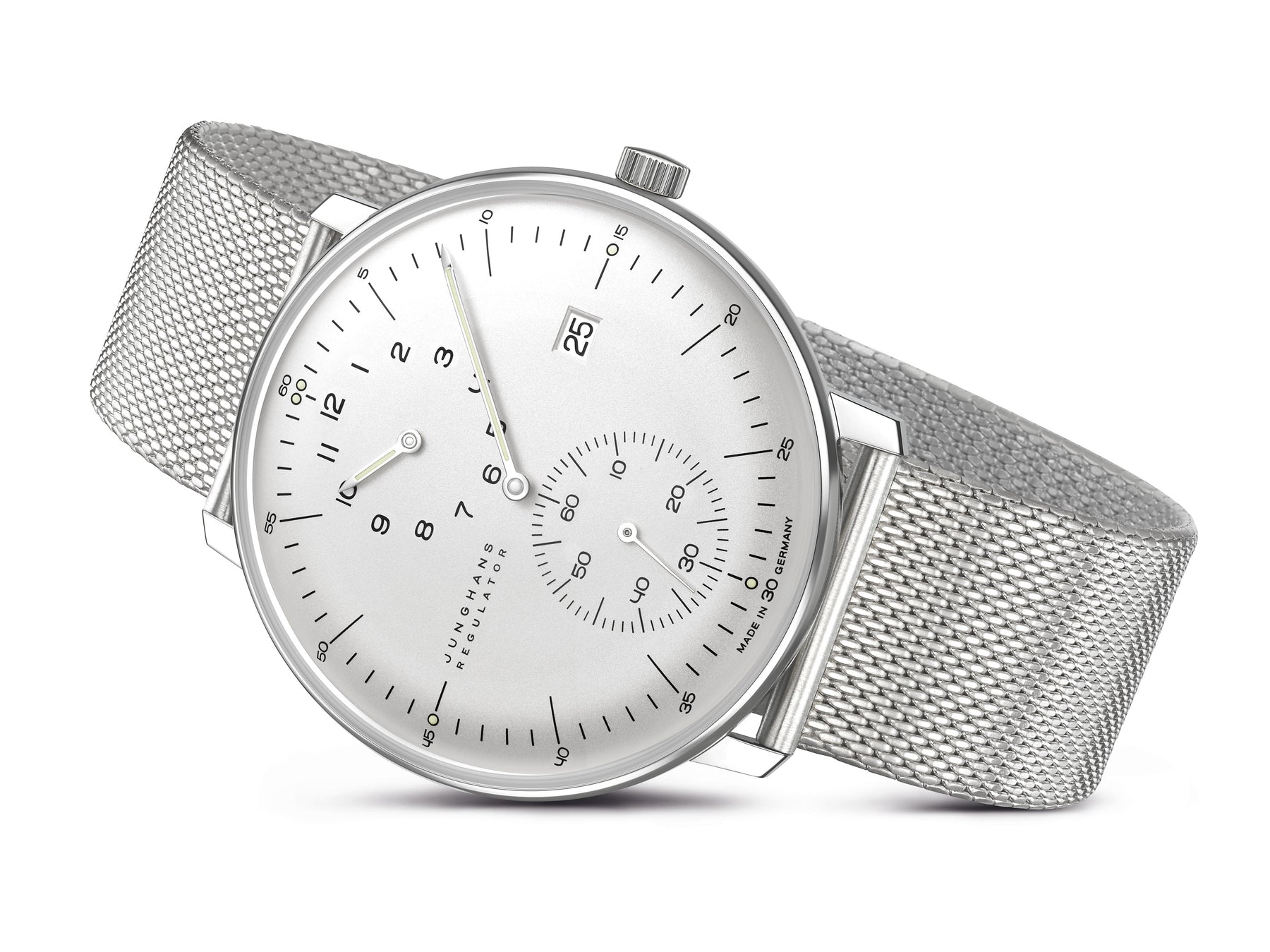 Die Max Bill Regulator zeigt das typische Gesicht der Modellreihe mit einem dezent silbernen Zifferblatt und einer nur für diese Modelle entworfenen Schrift. Die Bezeichnung "Regulator" weist darauf hin, dass das Zifferblatt eine besondere Anordnung mit einem zentralen Minutenzeiger sowie dezentralen Stunden und Sekundenzeigern aufweist.