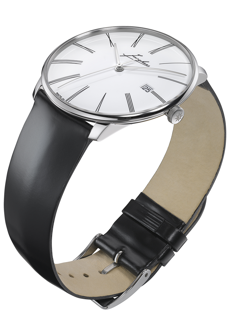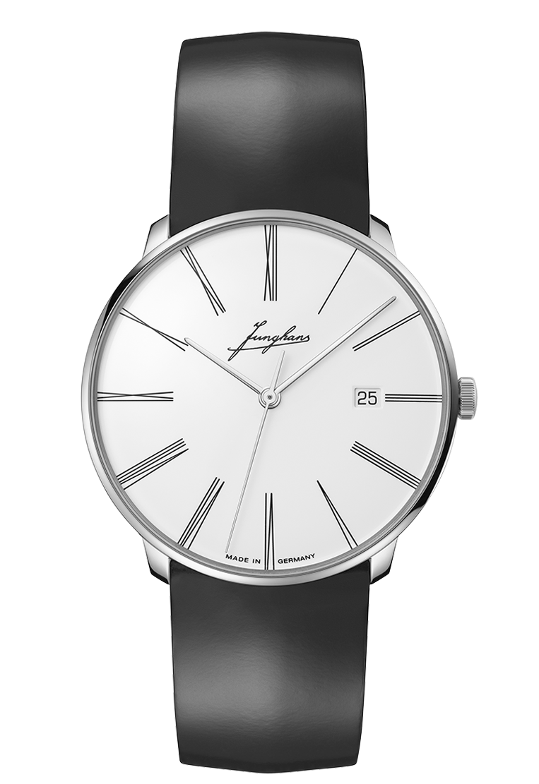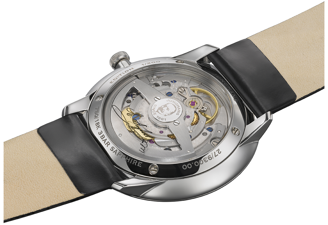 Eine Ehrung für Erhard Junghans ist auch eine Wertschätzung des traditionellen Uhrendesigns. Angefangen beim historischen Junghans Schriftzug bis hin zu den feinen römischen Zahlen des Zifferblatts. Die Zahlen wirken wie längliche Markierungen und sind auf die Geometrie der Meister Linie abgestimmt. Die Rückseite des Gehäuses steht im Zeichen des Gründers. Der gewölbte Saphirglasboden trägt eine Signatur, während der zweischenklige Rotor ein eingraviertes Profil von Erhard Junghans zeigt. Eine schöne Erinnerung daran, dass sein Einfluss auch heute noch die Motivation des Unternehmens ist. Dieses Modell ist auf 200 Uhren limitiert.