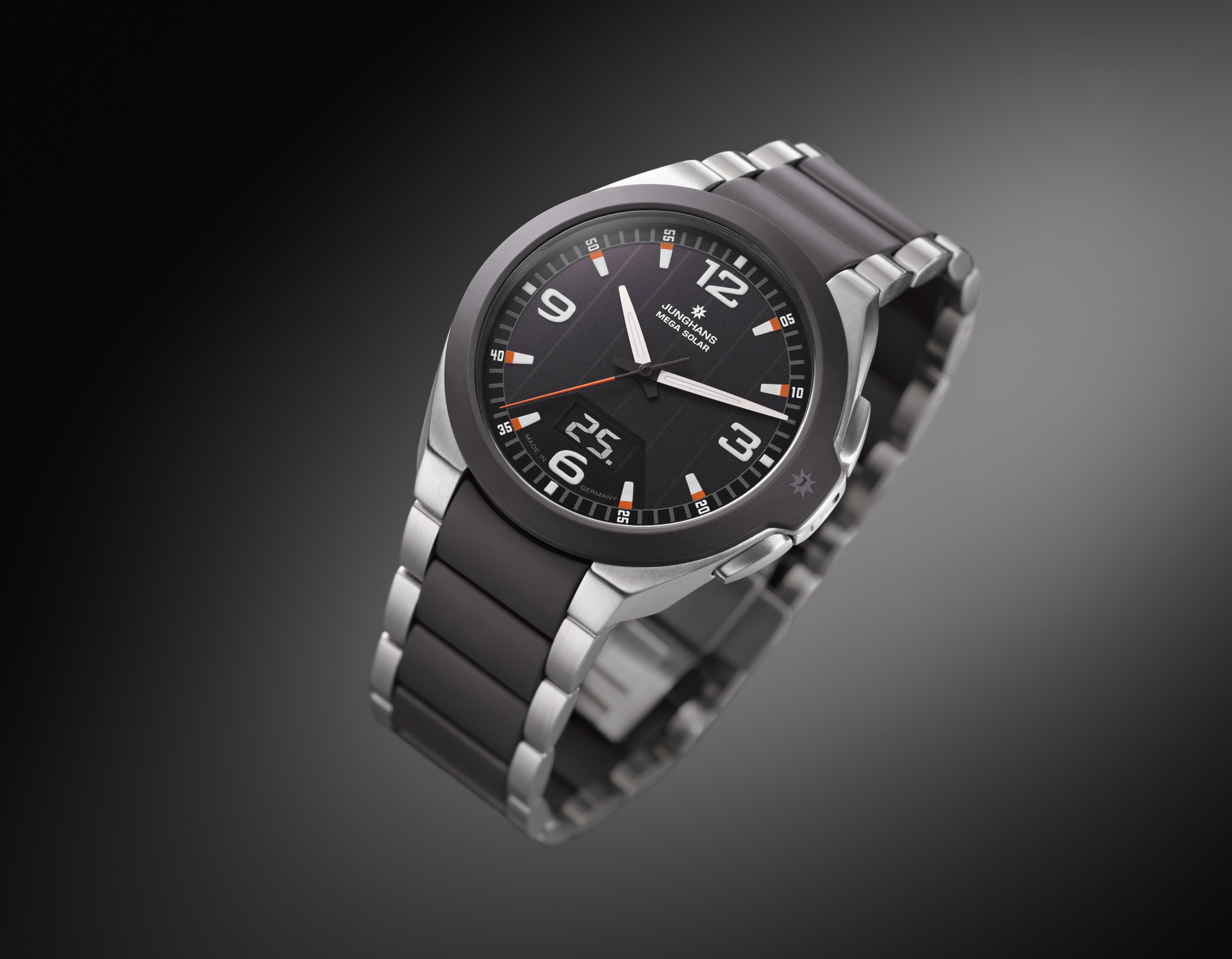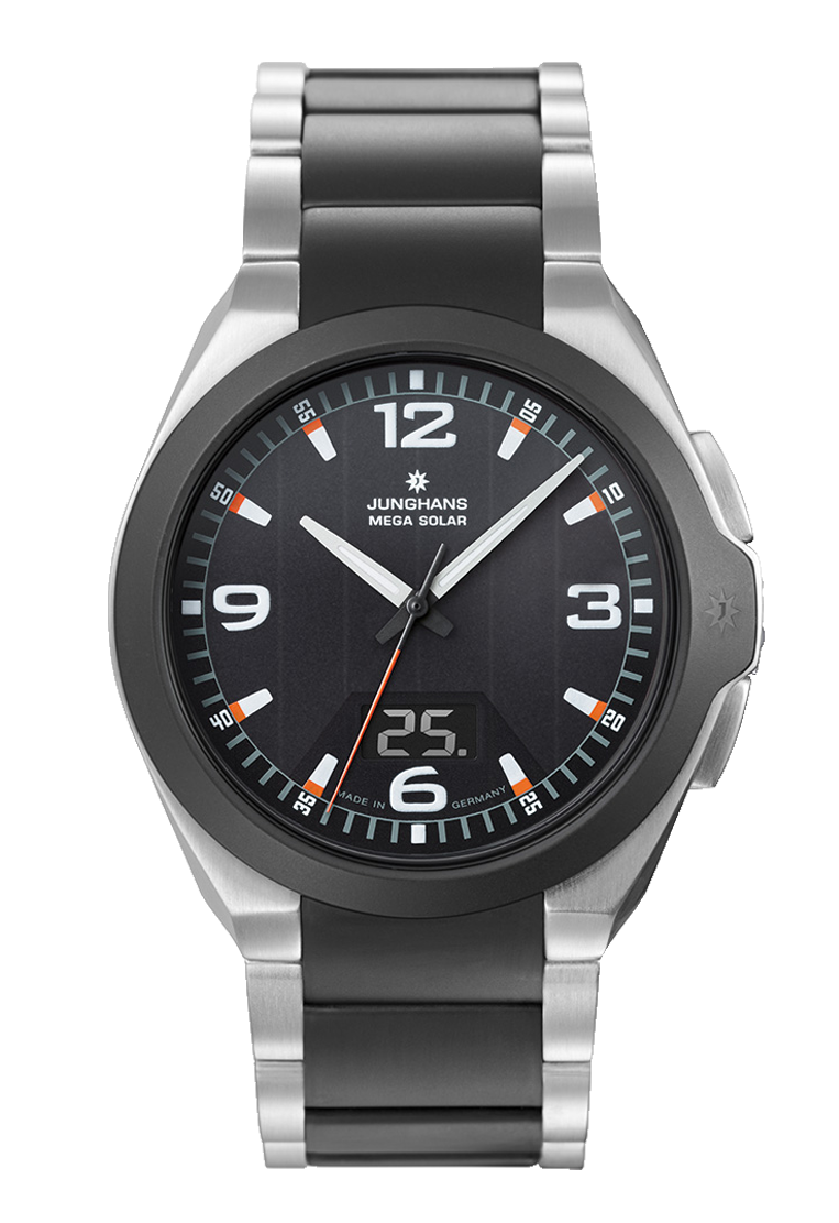 Die Junghans Spektrum Mega Solar kombiniert kühlen Edelstahl mit robuster, kratzfester Keramik und einer beeindruckenden Wasserdichtigkeit von bis zu 10 bar – ideal für Sportler und Outdoor-Fans. Ihr inneres Junghans Multifrequenz-Funkwerk wird nachhaltig durch Sonnenenergie betrieben. Diese Solaruhr zeichnet sich somit nicht nur durch außergewöhnliche Präzision aus, sondern überzeugt auch durch ihre umweltfreundliche Energiequelle.