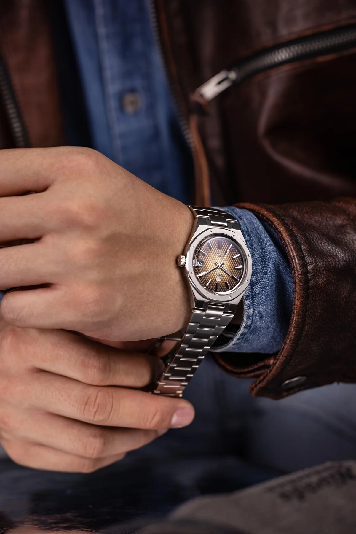 F77: EINE SCHLAFENDE SCHÖNHEIT ERWACHT Die F77 ist jetzt wieder da, und zwar nur mit einem Armband aus 316L-Edelstahl. In einer Größe von 37 mm bleibt sie ihrem ursprünglichen Stil treu. Das Zifferblatt mit "Carbon-Effekt" zeigt markante Stab-Indizes. Die schlanken Stunden- und Minutenzeiger passen perfekt zum sauberen Design des Stahlgehäuses. Mit einer Dicke von 12,65 mm ist dieses Schmuckstück angenehm zu tragen. Vier Modelle eröffnen die Auswahl mit zwei verschiedenen Zifferblattfarben: Schwarz oder Blau, jeweils mit oder ohne Datumsanzeige. Die F77 wird von einem Schweizer SOPROD P024 Automatikwerk angetrieben, wahlweise mit oder ohne Datum (ohne Geisterposition), und bietet eine beeindruckende Gangreserve von 38 Stunden.