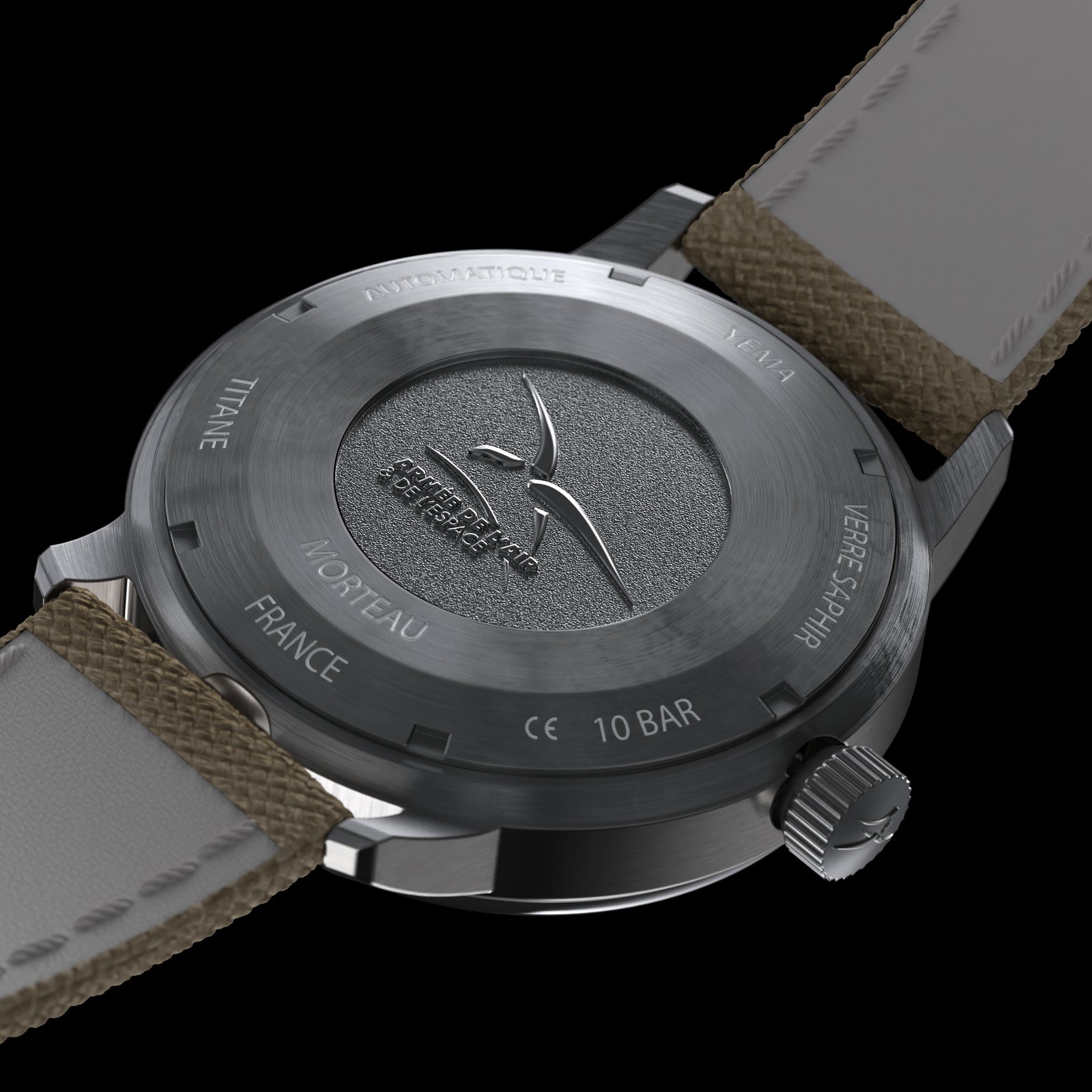 Prägnante Details Der Titan-Gehäuseboden ist mit dem Logo der französischen Luftwaffe geprägt. Super-LumiNova BGW9 auf Zeigern und Indizes sorgt für perfekte Ablesbarkeit bei Dunkelheit.