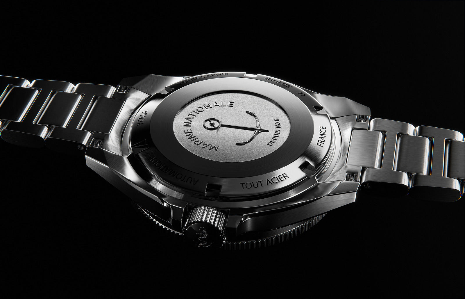 Robustes Gehäuse Das neu gestaltete 316L Edelstahlgehäuse mit 38,5 mm Durchmesser und 12 mm Bauhöhe bietet Neo-Vintage-Größe und eine Wasserdichtigkeit von bis zu 300 Metern. Die verschraubte Krone zeigt den Anker der französischen Marine.