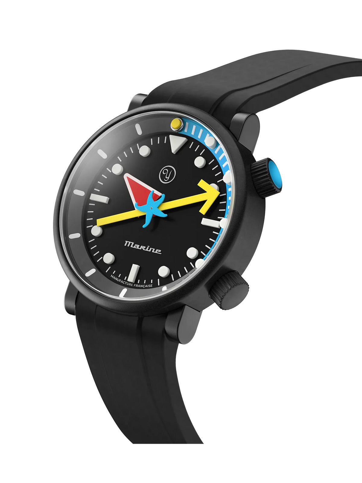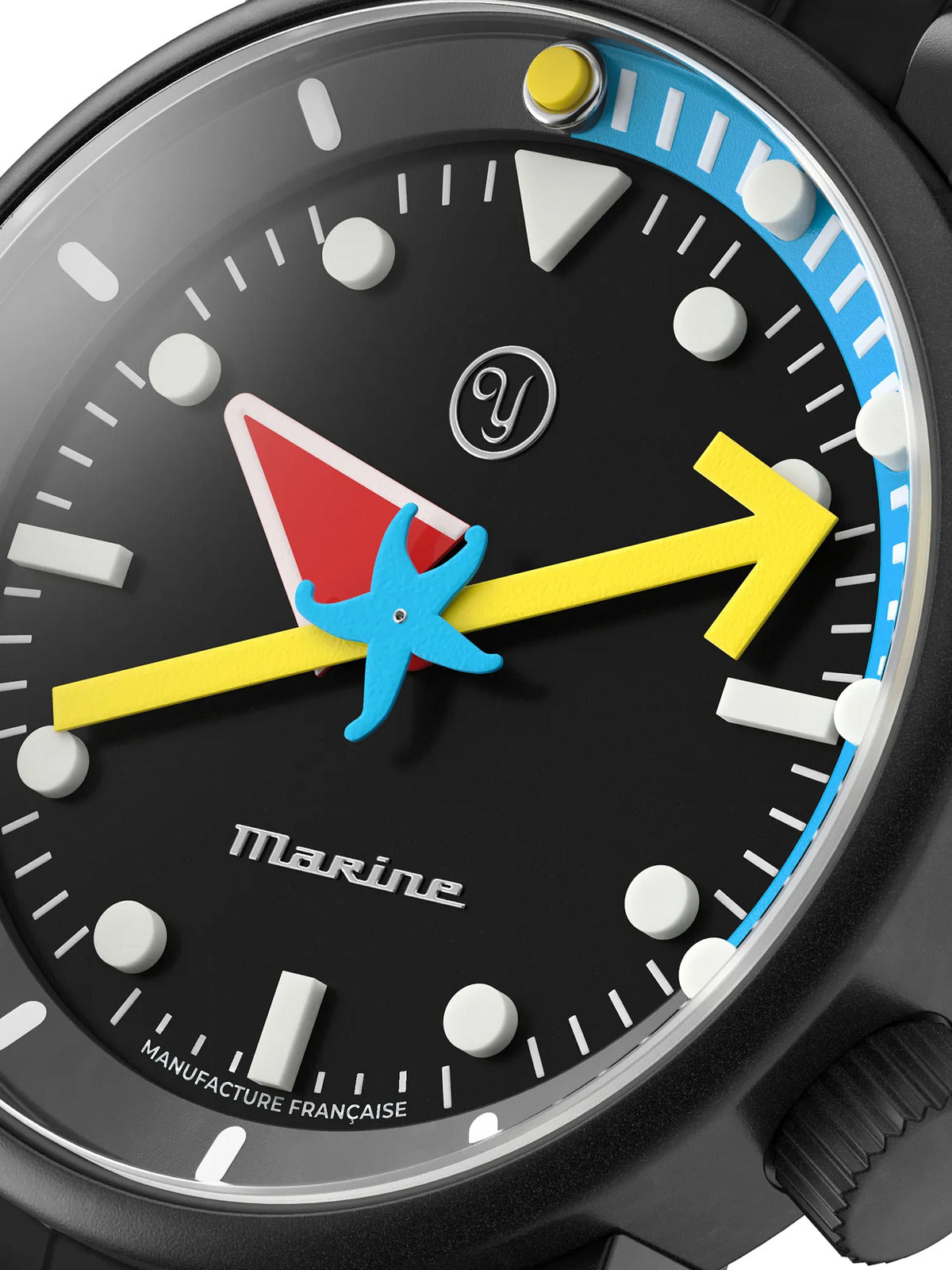 Diese außergewöhnliche Sammleruhr vereint avantgardistisches Design mit hoher Uhrmacherkunst. Alain Silbersteins markante Farbakzente – ein roter Stundenzeiger, ein gelber Minutenzeiger und ein blauer Sekundenzeiger – kontrastieren eindrucksvoll mit dem schwarzen Zifferblatt. Leuchtende 3D-Indizes mit Super-LumiNova sorgen für eine unvergleichliche Tiefenwirkung. Das DLC-beschichtete Titan-Gehäuse (Grade 5) kombiniert Leichtigkeit mit Robustheit. Im Inneren schlägt YEMAs Mikrorotor-Kaliber CMM.20. Die auf 500 Stück limitierte Edition besticht durch kunstvolle Details wie ein Koi-Motiv auf dem Gehäuseboden und zwei luxuriöse FKM-Kautschukbänder. Ein Statement für Designliebhaber und Sammler!